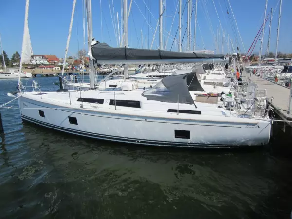 self tackin jib, battened main sail, lazybag, mooring kit, sprayhood, teak on cockpit floor, 2 helmsman seats, foot rests at helmsman position, 2 spring cleats, electr. windlass, chain counter, Delta Anchor and chain, Coach roof side windows with openable portlight on stb, Hanse safety cloud with 24 months subscription and device installed on board, Battery set, capacity: 1x 90 Ah + 2x 160 Ah AGM, Shower unit in cockpit, warm-/coldwater, Wind indicator, flag pole, mooring kit, bow thruster, shallow keel
