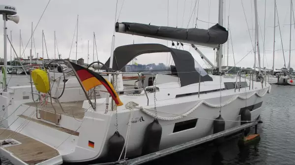 Full battened main sail, self-tacking jib plough anchor, zinc coated Delta anchor lazy-jacks mooring lines fenders AC shore supply 220 volts battery charger for AC shore supply CE adaptor and cable sprayhood electr. windlass cockpit in teak battery package 1x 90Ah, 2x 160Ah genoa rails Bow thruster Rail gate openings