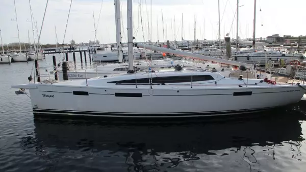 Lattengroß, Fock Anker Lewmar Delta 16kg elektr. Ankerwinsch mit Ankerkette Lazy-jacks und Lazybag, schwarz Festmacherleinen & Fender Landanschluss 220 Volt Ladegerät für 220 Volt Landanschluss CE Adapter und Kabel Sprayhood, schwarz Doppelsteueranlage Arbeitsplatte Pantry, Schwarz Teak im Cockpit Cockpittisch mit Teakflügeln Springklampen Flachkiel 1,60m