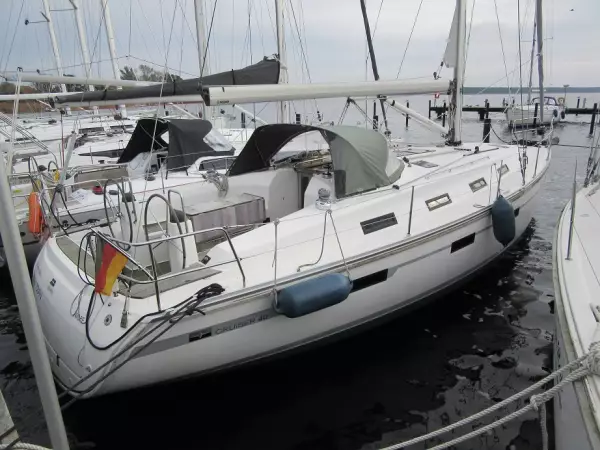 furling main sail, furling genoa Furlex system Volvo Penta D1-30 and Volvo sail-drive plough anchor, zinc coated anchor chain electrical windlass mooring lines fenders AC shore supply 220 volts battery charger for AC shore supply CE adaptor and cable sprayhood spotlight 12 volts battery charger bow thruster shallow keel